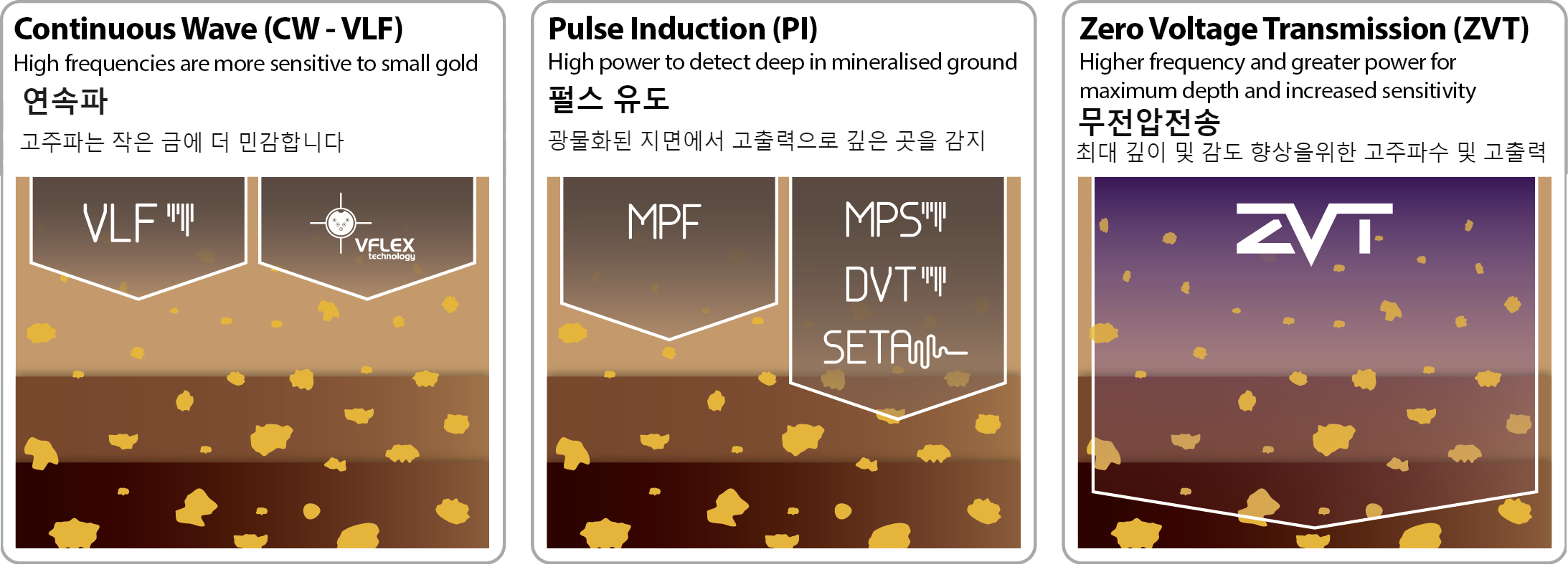 ZVT 기술은 모든 금채굴자를 위해 한단계 발전된 기술로 실질적으로 향상된 깊이를 제공합니다. 더 이상 그라운드 미네럴 반응에 어려움을 겪는 VLF 탐지기나 다양한 금 크기 및 구성에 영향을받지 않는 펄스인덕션 탐지기를 사용하는 것으로 제한되지 않습니다.