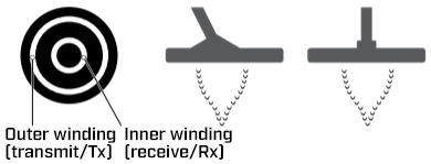 동심 코일의 발신부는 코일 외부에 있고 수신부는 중앙에 있으며 원뿔 모양의 탐지패턴을 생성합니다. 이는 탐지시 더 많은 지역을 겹쳐 스윙하는 것이 필요하지만 타겟을 정확히 지정할 때 가장 정확한 경향이 있습니다.